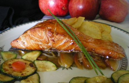 Lomo de salmón sobre manzanas caramelizadas con sidra