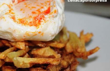 Huevos poché (escalfados) con sobrasada sobre nido de patatas paja