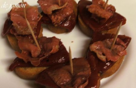 Pinchos de pan frito con primientos del piquillo confitados y crujiente de jamón