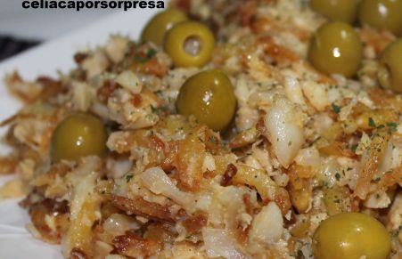 Los ingredientes de este típico plato son el bacalao en salazón que se desala un día antes y el huevo que se hace revuelto junto con unas patatas muy finamente cortadas y que se fríen por separado (patatas paja). Cuando se sirve, se suele acompañar de perejil y olivas negras. Como en casa nos gustan mucho más las aceitunas verdes, las sustituimos por las negras.