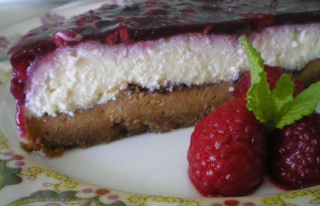 Exquisita tarta de requesón sobre base de galletas y recubierta con mermelada de arándanos.Ideal como colofón a un estupendo almuerzo o para la merienda.Se tiene que degustar fresquita, fresquita.Contraste del sabor ácido de la mermelada con el dulzor del requesón y la galleta.