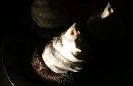 Deliciosos merengues en forma de fantasmas sobre galletas bañadas en chocolate y rebozadas en coco rallado, una golosina de lo más divertida para la merienda de Halloween
