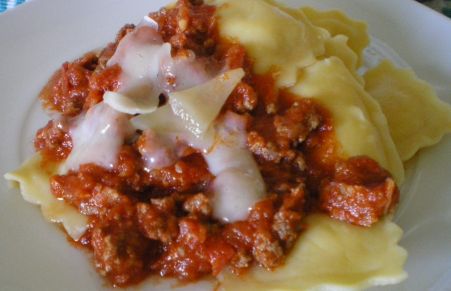 La receta que os propongo de raviolis de queso, van acompañados de una salsa de tomate con carne picada de ternera y beicon, que cuece y reduce por espacio de 1 hora y media, con lo que conseguimos una base de tomate realmente deliciosa y fina.
