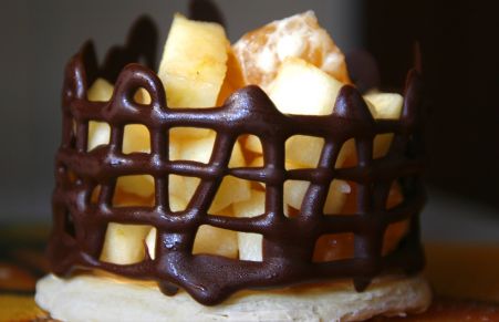 Es una "jaula" hecha de chocolate negro sobre discos de hojaldre