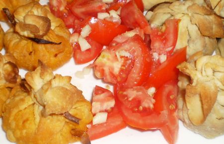 Saquitos de verduras con gambas y de morcilla con manzanas