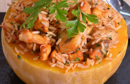 Busca todas las fotos que hemos recibido para esta receta de Calabaza rellena con vieiras, langostinos y arroz.