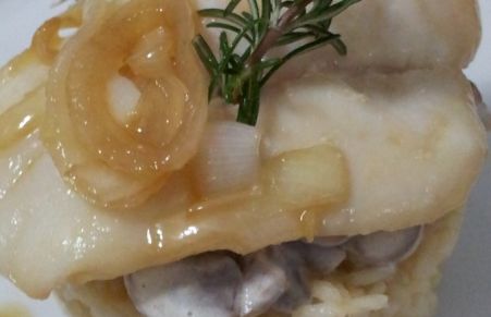 Arroz a la mostaza con champiñones y pescado caramelizado