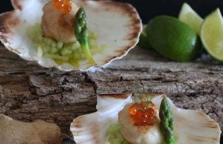 Uno de los moluscos más conocidos y apreciados, unas vieiras frescas a la plancha con pepino, huevas de salmón y una vinagreta de aceite con jengibre y lima