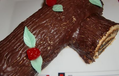 Es un brazo de gitano relleno de una crema de turrón, decorado en forma de tronco navideño cubierto de chocolate