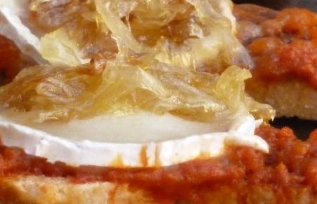 Tosta de sobrasada, rulo de cabra y cebolla confitada