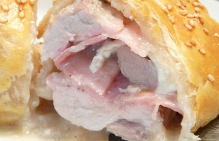 Solomillo de cerdo relleno de queso, bacon y cebolla caramelizada, envuelto en hojaldre