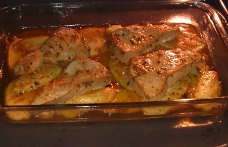 Lomos de atún sazonados y cocinados al horno con patatas.