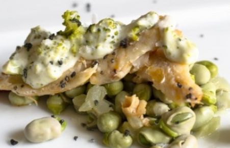 Salmonetes con habitas baby encebolladas y falsa carbonara de brócoli