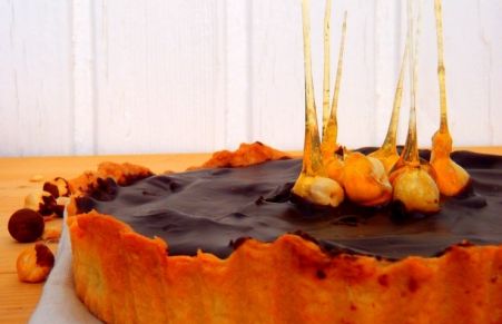 Tartaleta de chocolate trufado, con toques de naranja, y trozos crujientes de avellana que podemos encontrar en el blog de "El dragón de la fresa".