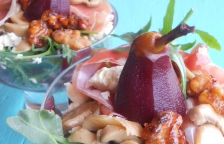 Ensalada de pera confitada, nueces caramelizadas, queso azul y jamón ibérico