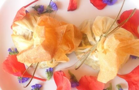 Saquitos de masa brick rellenos de pollo con pistachos y especias