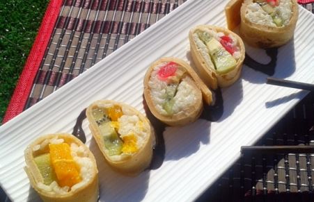 Esta receta a los niños les va a encantar sobe todo si os gusta el arroz con leche un sushi dulce , que vamos a preparar con unos sencillos creps , arroz con leche y frutas .