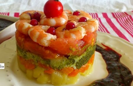 Timbal de brócoli y langostinos en vinagreta de frutos rojos