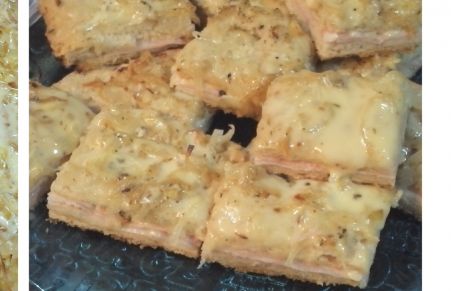 Fugazza rellena de jamón y queso cubierta con cebolla y mozzarella