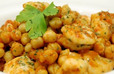 Garbanzos salteados con rape y gambas
