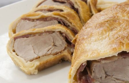 Solomillo ibérico al hojaldre con base de torta de barros y jamón ibérico