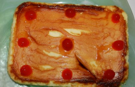Tarta de queso con caramelo líquido y cerezas en almíbar