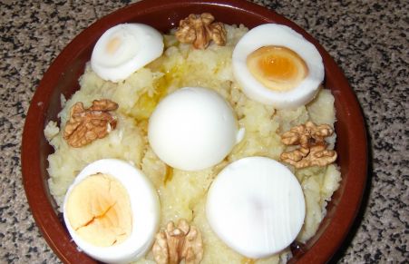 Este es un plato típico manchego. La leyenda cuenta que el plato surgió en una gran nevada, cuando unos pastores no tenían para comer nada más que patatas y unas raspas de bacalao. Cocieron las patatas con el bacalao y las machacaron mezclándolo, pero al ver que no era suficiente empezaron a echar aceite de oliva y moverlo con el mortero. La mezcla engordó y se pegaron una comilona tal que al acabar dijeron "esto harta hasta las burras" y de ahí el nombre.