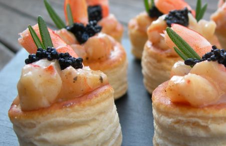 Una delicada tapa preparada con unos mini vol-au-vent y langostinos