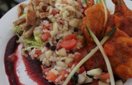 Delicioso pollo crujiente y suave a la vez con tamices agridulce acompañado de una ensalada fresca donde el ingrediente principal es el arroz y su vinagreta agridulce de remolacha.