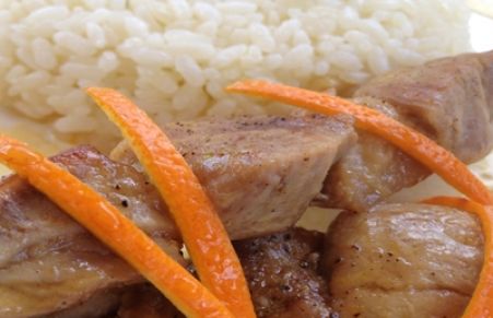 Unas fáciles y deliciosas brochetas de solomillo de cerdo acompañadas de una suave salsa de naranja.