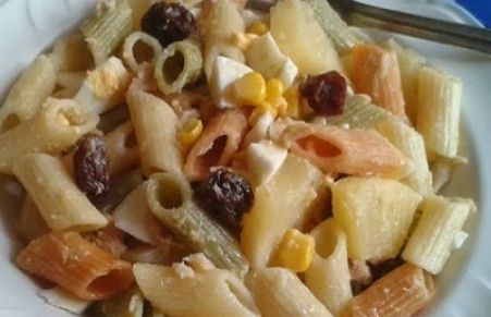Ensalada templada de macarrones con vegetales, atún y pasas