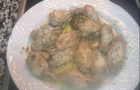 Cortamos el ajo muy fino y lo doramos un poco no dorado del todo. Salpimentamos las alitas de pollo mientras se hace el ajo. Cuando el ajo este dorado lo retiramos. Doramos las alitas de pollo. Mientras que se doran las alitas machacamos el ajo en un mortero. Después de dorar las alitas añadimos el ajo machacado con un poco de agua echada en el mortero así se echa mejor el ajo. Cuando esté bien caliente añadir el vino y dejar un tiempo para evaporar el alcohol después cubrir de agua y añadir una pizca de sal y perejil. Sin cerrar la tapa dejar que se haga hasta que se evapore el agua y listo.