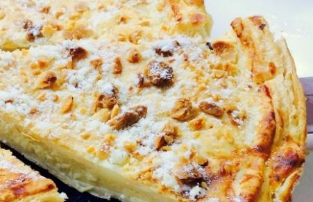 Hoy probamos con un pastel clásico de Euskadi, cuyo origen es italo-francés según cuentan los paladares más doctos. Consta de una base y una tapa de hojaldre, con un relleno de crema pastelera y luego a la tapa la sembramos con almendra blanca que se nos tuesta mientras crece el hojaldre en el horno.