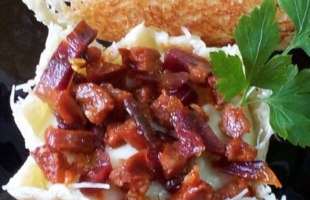 Puré de patatas con crujiente de chorizo y jamón en cestitas de queso parmesano
