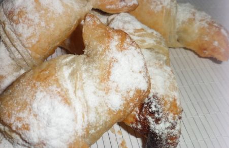 Y después le ponemos una cucharada de nutella y los vamos enrollando de lo mas grueso hacia lo mas fino hasta que quede con la forma de los croissant, luego lo ponemos en el horno con el aire unos 15 minutos y ya están listos, cuando se enfríen le ponemos el azúcar glas.