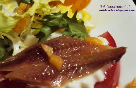 Ensalada de queso burgos y anchoas con vinagreta de fruta