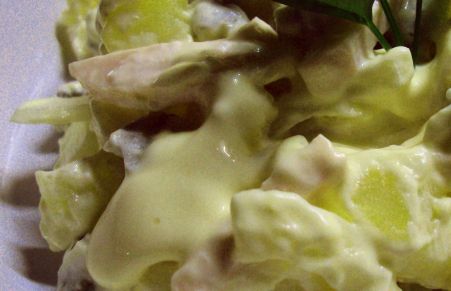 Originalmente, esta ensalada lleva salchichas alemanas en vez de Jamón york o pechuga de pavo, la mostaza es de la antigua, y los pepinillos también unos típicos de allí, ( para mí demasiado fuertes ); ...se le pueden añadir también trocitos de manzana.