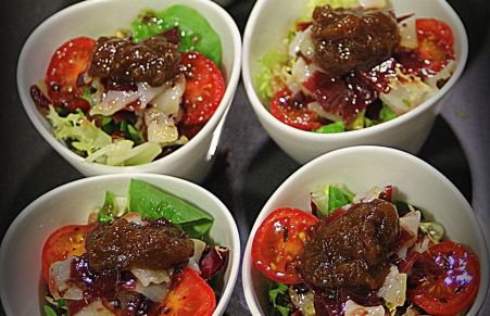 Ensalada de jamón de pato con vinagre de frambuesas y mermelada de higos