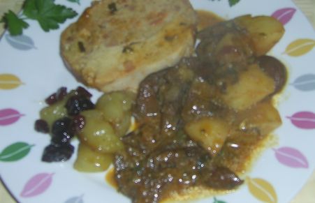 Saltear las setas variadas,luego las pasas, las ciruelas ,la manzana y la mermelada Hero de naranja amarga, en una sartén a fuego lento con una pizca de margarina light,hasta que suelten su propio azucar ,retirar,(separaremos una cantidad para guarnición) con el resto ,el queso y el jamón de york, rellenamos el pollo previamente deshuesado..atar con hilo de algodón y ponerlo en el horno,junto a unas patatas cortadas,pasado los 45 minutos cortarlo a rodajas..y poner un poco de guarnicion que habiamos separado..