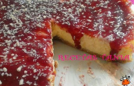 Tarta de queso con mermelada de frambuesa y chocolate blanco