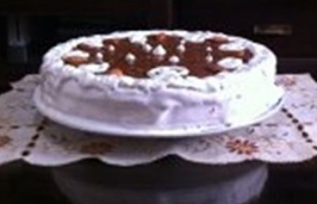 bizcocho relleno de crema pastelera y mermelada de higos, decorado con nata montada.