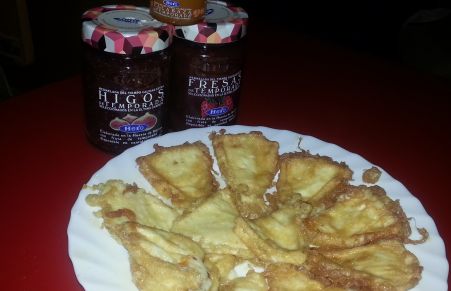 Se corta el queso semicurado en triangulitos, se reboza en harina, después en huevo batido y se frie, vuenta y vuelta.Se pone sobre papel absorvente para eliminar restos de aceite sobrante y se coloca en un plato. Se unta con mermeladas al gusto y se come...una verdadera delicia....