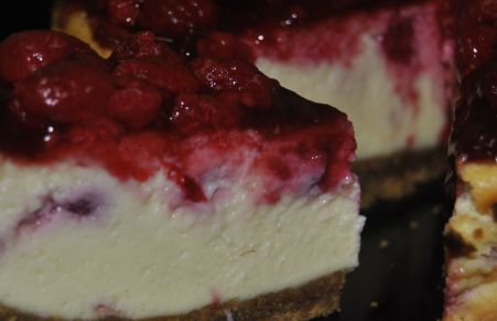 Tarta de queso con frambuesas y mermelada de frutos rojos