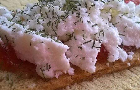 Tosta de pan integral con confitura de tomate y sobre la confitura lleva desmigado queso de cabra de rulo. Terminamos nevandolo con eneldo al gusto