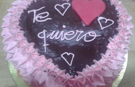 DELICIOSO BIZCOCHO DE BROWNIE RELLENO DE NATA CON FRESAS Y CUBIERTO DE MERMELADA DE FRESAS.