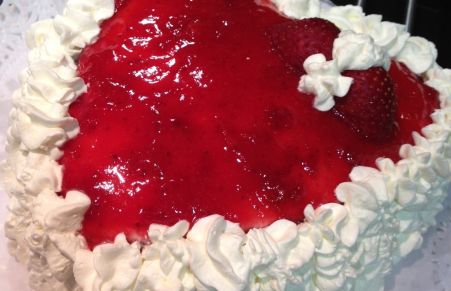 Una deliciosa tarta con un bizcocho de chocolate, rellena de nata y fresas. Cubierta de un sirope de fresas casera y adornada con nata.