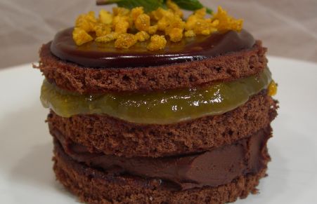 Bizcochito con mermelada de melocotón, ganache de chocolate y mango crunch