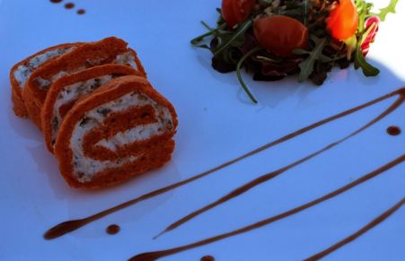 Tronco de pimiento del piquillo relleno de torta del casar, nueces y jamón
