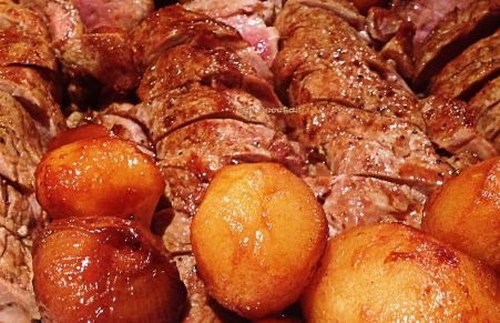 Solomillo de cerdo con chalotas glaseadas en una reducción de Pedro Ximenez, acompañado de patatas noisette