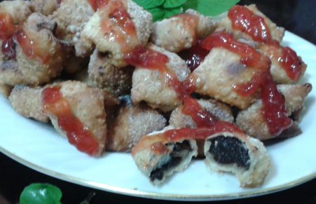 Pequeños bocaditos de masa de empanadillas rellenos de una deliciosa pasta hecha con morcilla y mermelada Hero Temporada de fresa.decorados con azucar glass, mermelada y unas hojitas de menta fresca.